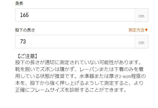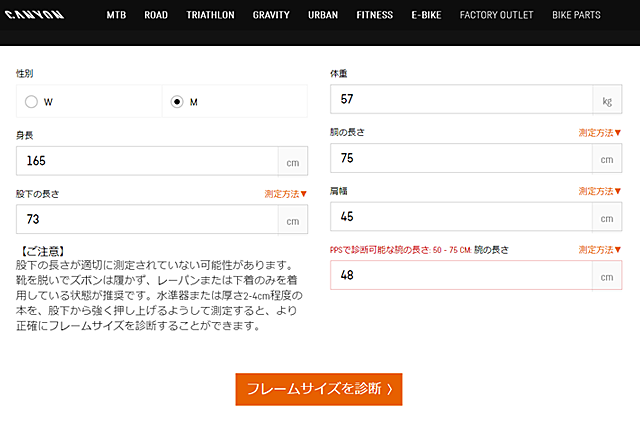 と言う訳でキャニオンのサイトでボディサイズを入力してバイクの適正サイズを調べた結果...