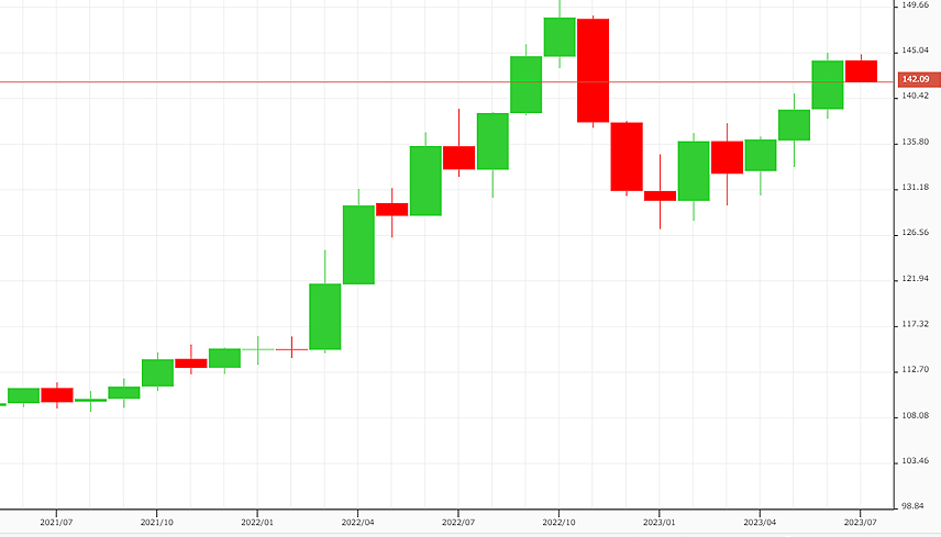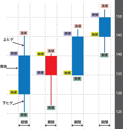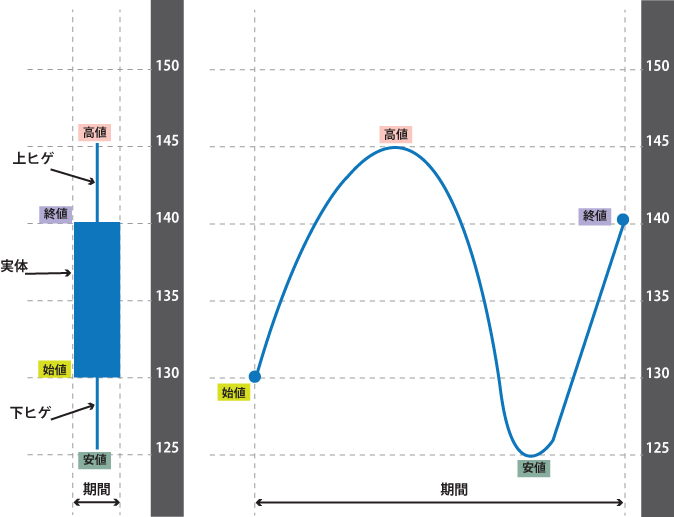 一番左側の期間を見てみると、130円から始まり、145円の最高値を着け、その後125円まで下落し、140円で期間を終える。