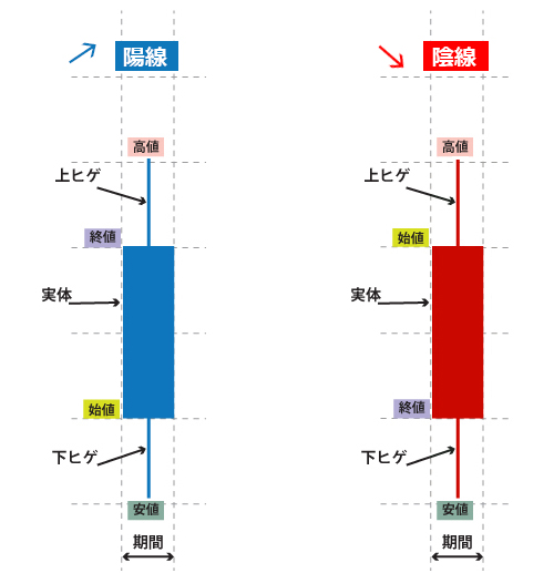 値上がりを示すローソクを陽線、値下がりを示すローソクを陰線と呼ぶ。