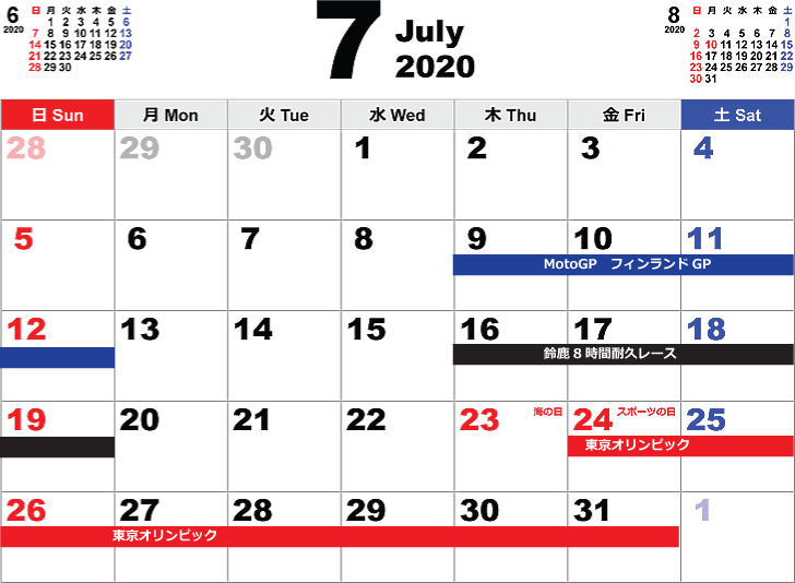 ちょい気が早いけれど、来年、2020年の夏のカレンダー。