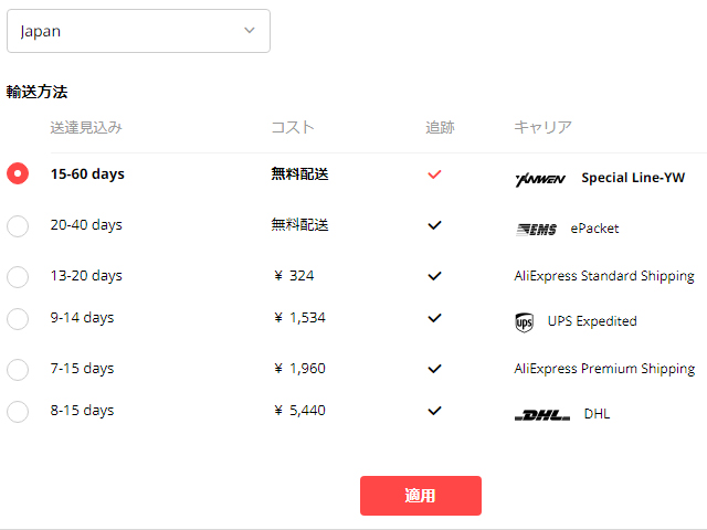 Aliexpress Standard、Aliexpress Premiumは、基本的に中国国内の配送についての種別。