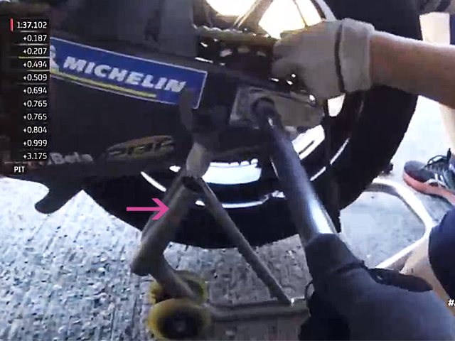 耐久レーサーならアクスルシャフトは通常作業では抜けないので別に必要ないのだけど、MotoGPやSBK等は普通に抜けるので、抜いたアクスルシャフトの置き場が必要な訳。