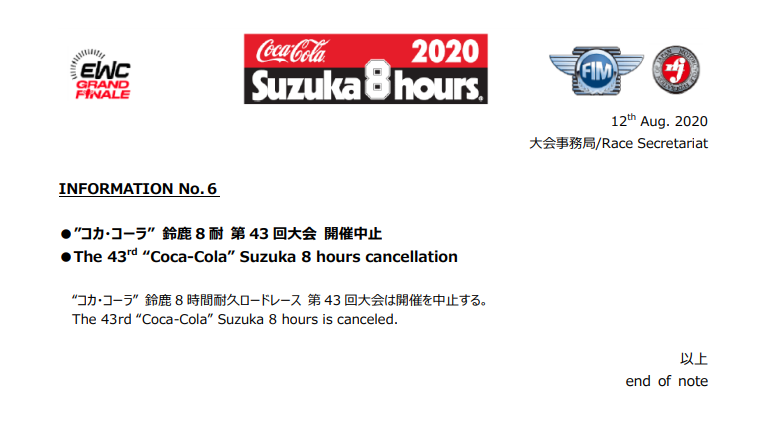 この非常にあっさりしたメッセージにより、本年度の8耐は中止が決定。