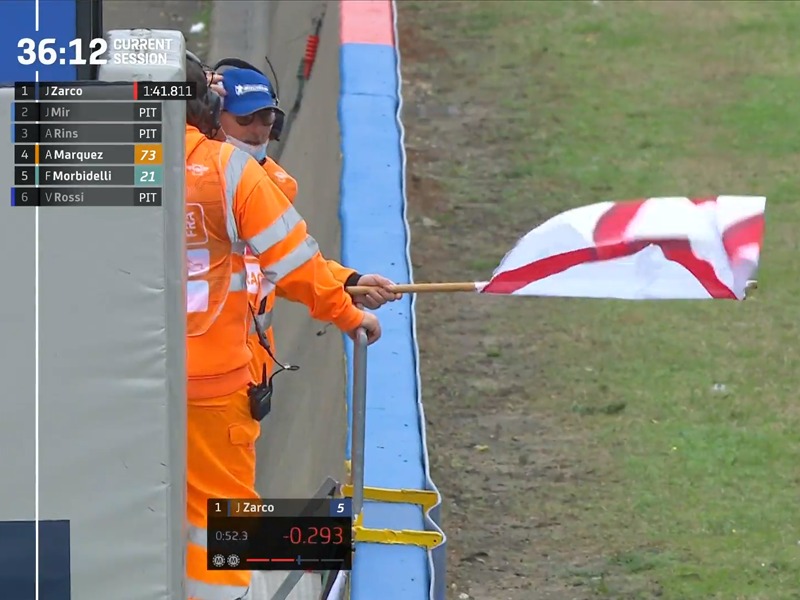 Moto3クラスFP2ではほぼドライと成ったものの、MotoGPクラスFP2開始早々に無情の赤バッテンフラッグ。