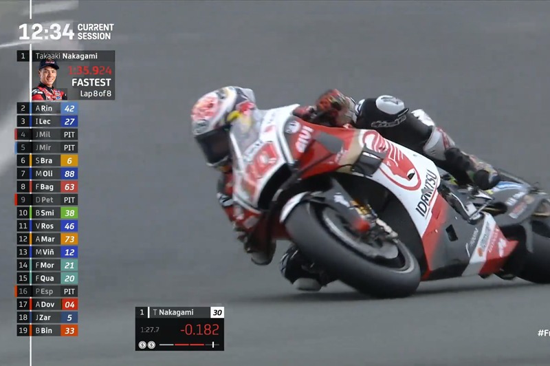 だが気合入れすぎたのか、赤ランプがピコピコするマシントラブルに見舞われたザルコを尻目に、ウェットパッチの残る中でスリックで飛び出したミラーが一気にトップタイムを叩き出す。