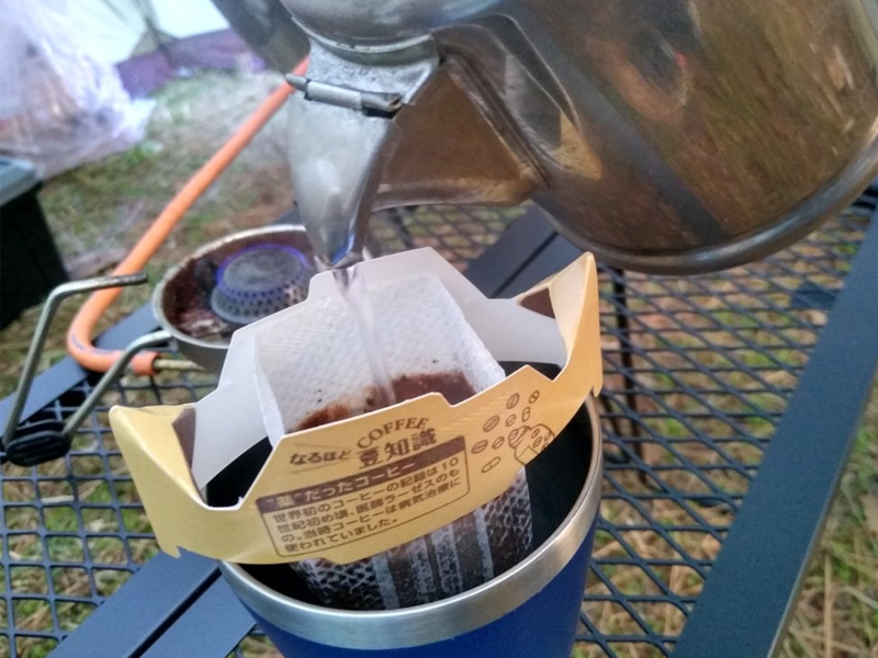 ガスストーブで個別パックのドリップコーヒーを入れる。