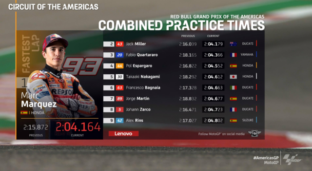 結果は、アメリカ最強マルク・マルケスが、ウェットのFP1に続いてここでもトップ。
