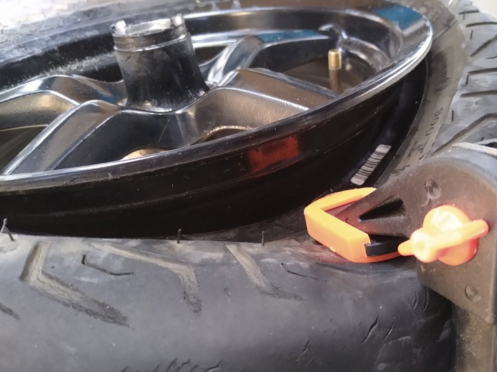 オフ車のタイヤなら、片足で踏んでやれば事足りるのだけど、ロード用のラジアルタイヤは足で踏むだけじゃビードを落とした状態を保持するのは困難なので、何かしらの対策は用意してた方が安心だ。