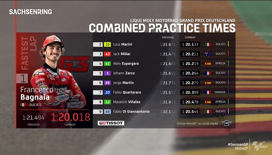 ドゥカティの今日と明日を背負う男がトップタイムを出すと、ドゥカティの明々後日くらいを背負うルカ・マリーニが何の前触れも無くいきなりスーパータイムで2番手。