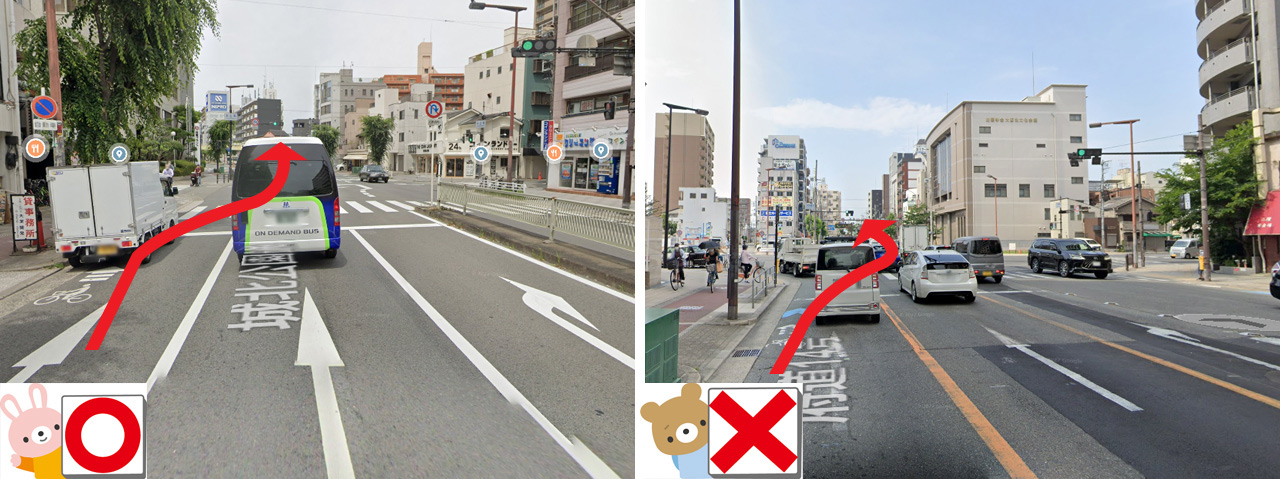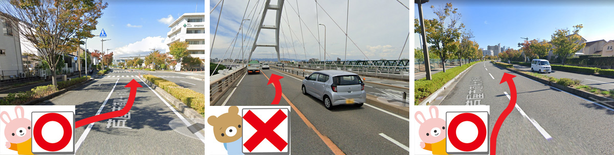 要するに、右折や左折専用車線を直進、または直進専用車線を右左折しちゃダメだって事。