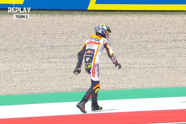 バニャイア、マルティン、ビンダーが赤ランプを点灯させる中、マルク・マルケスがこのタイミングでまさかの転倒。
