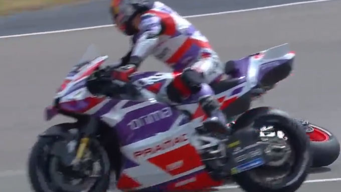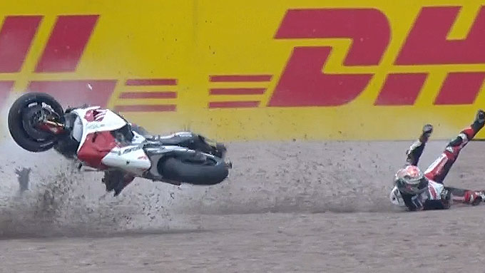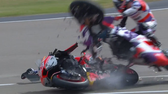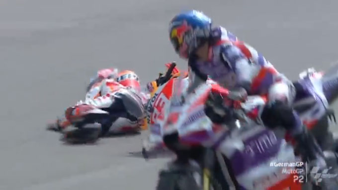 マルク・マルケスが転倒し、不運にも滑った先でゆるっと走ってたザルコにヒット。