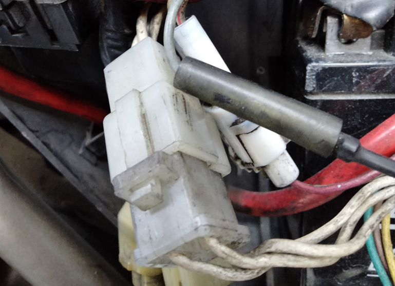 エンジン稼働中にバッテリー端子間の電圧がエンジン停止時と変わらないなら、バッテリー付近のコネクタを抜いて白い3本のケーブルの交流電圧を測定する。
