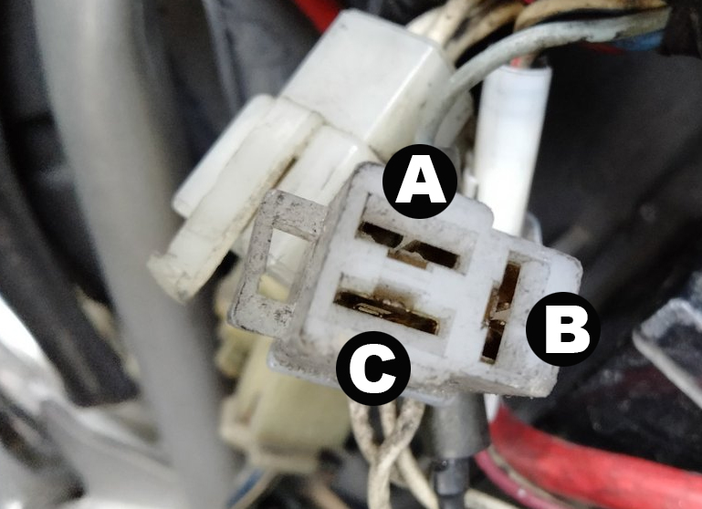A-B間、B-C間、C-A間のそれぞれを測定して、アイドリング状態でそれぞれが交流20V以上で安定しているにも関わらず、バッテリーの端子間で電圧が上がらないなら、レギュレートレクチファイヤからバッテリーに繋がる間に有るヒューズを確認。
